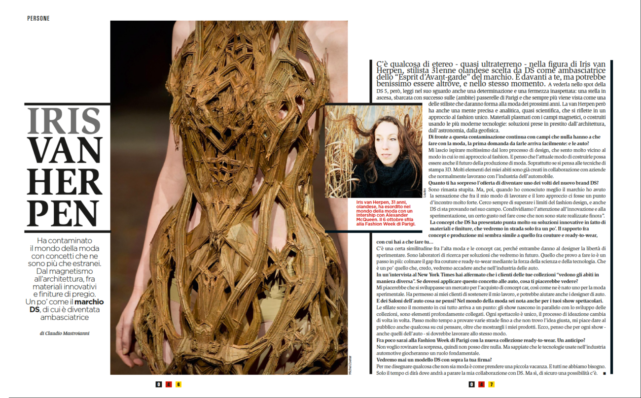 C’è qualcosa di etereo – quasi ultraterreno – nella figura di Iris van Herpen, stilista 31enne olandese scelta da DS come ambasciatrice dello “Esprit d’Avant-garde” del marchio.